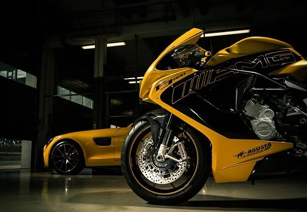 La MV Agusta AMG F3 800 adopta el color Solarbeam del Mercedes AMG GT S e incorpora detalles en color negro y etiquetas AMG. El asiento es de color negro con costuras de contraste amarillo y las llantas son de color negro con el borde en amarillo.